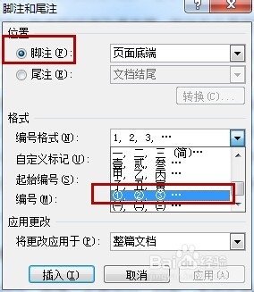 2、在脚注与尾注命令框中,选择脚注,在编号格式处选择我们需要的编号格式,一般是选择带圈圈的数字。