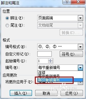 3、再然后我们还要在编号处改为每页重新编号。(当然这可以根据需要选择,实际操作)之后点击插入。