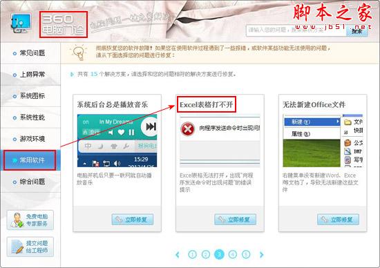 最后,经过上面的步骤,如果还没有解决问题,那么我们还可以打开360安全卫士,在电脑门诊里面,我们选择常见软件,然后就可以看见“Excel文件打不开”,我们打开按照解决就可以了。