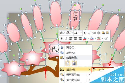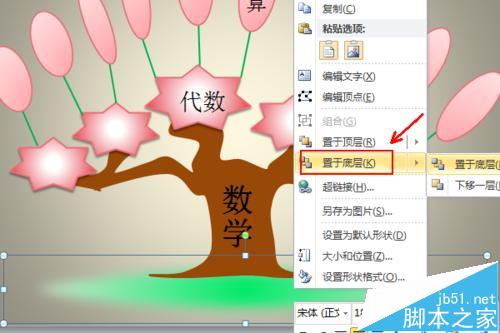 10、插入的“草地”如果和树根挨着比较近的话,会遮挡住树的底部影响效果,右击“草地”,选择“置于底层”,放到树根的后面,最后适当的调整草地的范围,到此我们的知识树基本就完工了,当然还有一些文字需要输入