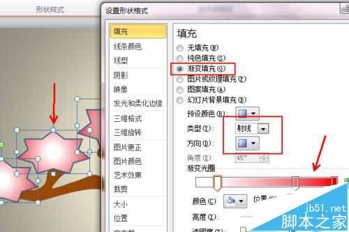 4、接着按住Ctrl逐一选择所有的星型,然后点击形状填充,选择渐变——其他渐变,点选渐变填充,类型为射线,方向为中心辐射,中心的颜色设置位白色,向红色渐变,点击确定,点击形状轮廓,将粗细设置位1.5磅,如图