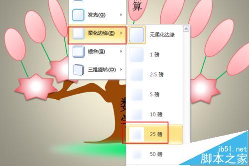9、最后可以添加一些草地,插入一个椭圆在树底,将颜色填充为中心辐射,使用草绿色就好了,然后点击形状效果,选择柔化边缘,25磅,如图所示