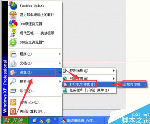 1、依次点击“开始菜单”——“设置”——“打印机和传真”——“添加打印机”。