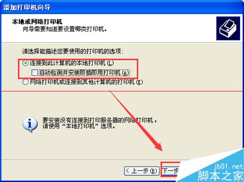 3、在“要使用的打印机的选项:”中选择“连接到此计算机的本地打印机”,去掉“自动检测并安装即插即用打印机”前面的复选框,然后点击“下一步”。