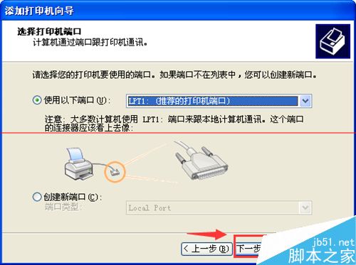 4、在“选择打印机端口”页面,保持默认配置不做修改,点击“下一步”。