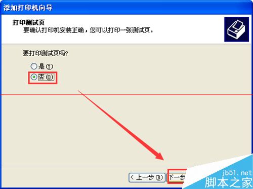7、“打印测试页”页面中选择“否”,不打印测试页,点击“下一步”。