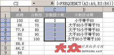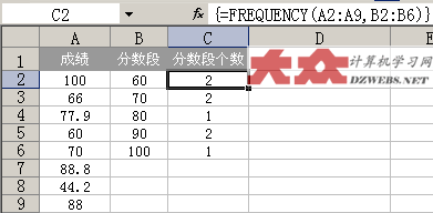 如上图一样,首先选中C2:C6这个范围的单元格,然后在FX函数输入栏中,输入公式:=FREQUENCY(A2:A9,B2:B6 然后,一起按下Ctrl+Shift+Enter这三个键,这样,上面的公式就自动变成 {=FREQUENCY(A2:A9,B2:B6} 多了一对大括号,注意哦,这对大括号不是通过键盘直接输入的,而是通过刚才的Ctrl+Shift+Enter这三个键按出来的。