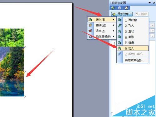 2)选择第二张图片--幻灯片放映--自定义动画--添加效果--进入--切入