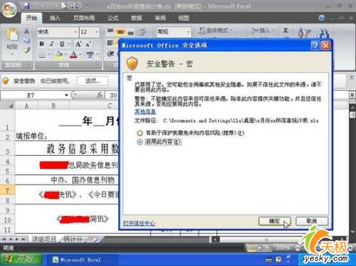 第一步:打开该文件,先解除默认的“宏禁用”状态,方法是点击工具栏下的“选项”状态按钮,打开“Microsoft Office安全选项”窗口,选择其中的“启用此内容”,“确定”退出(图2);