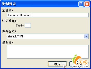 再切换到“视图”选项卡,点击“宏”→“录制宏”,出现“录制新宏”窗口,在“宏名”定义一个名称为:PasswordBreaker(图3),点击“确定”退出;