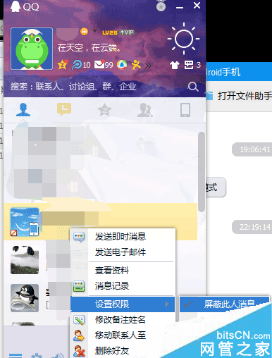 查看自己刚才给这个主动屏蔽的QQ信息有没有同步到手机上。