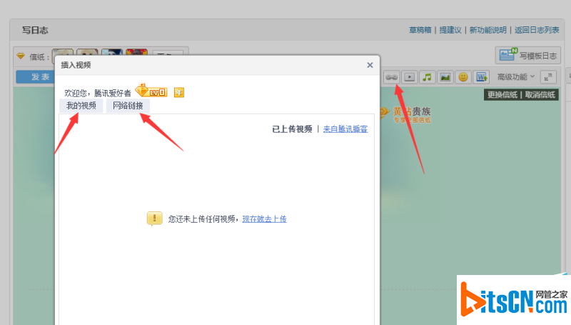 第二种:如何在空间日志中带入自己喜欢的视频。其实也和在说说中加入视频的方法一样,自己上传到qq视频上面或者在网络连接那里,添加别的网站的视频连接即可。