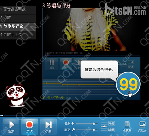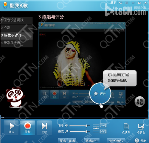 3、打开最下边的“评分”按钮,录完歌曲后,可以看出你唱的歌曲,能吃多少分;