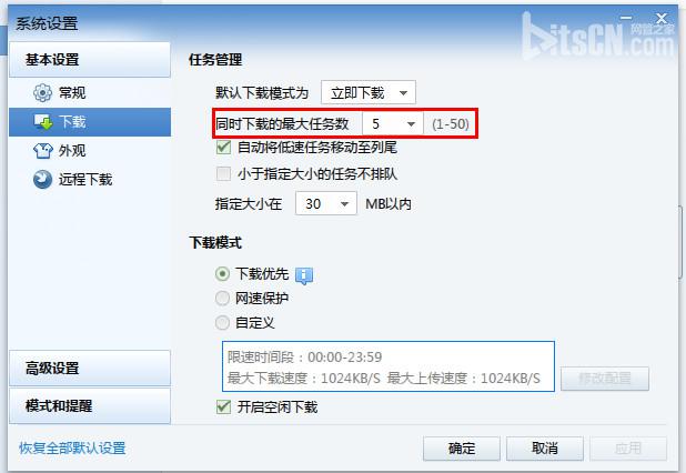 2、点击基本设置==下载===同时下载的最大任务数,我们将其设置为“1”点击“应用”和“确定”就可以了