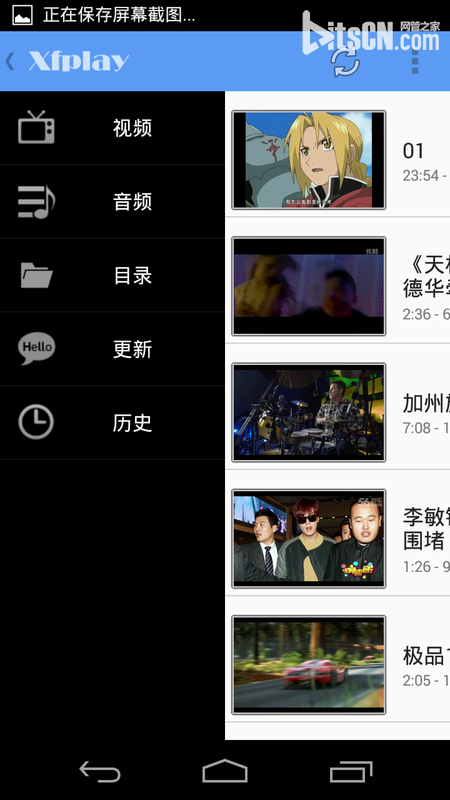 支持安卓4.x的holo风格,左侧右滑,能看到菜单。可以分类显示视频、音频、目录等。