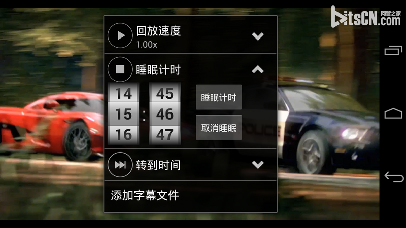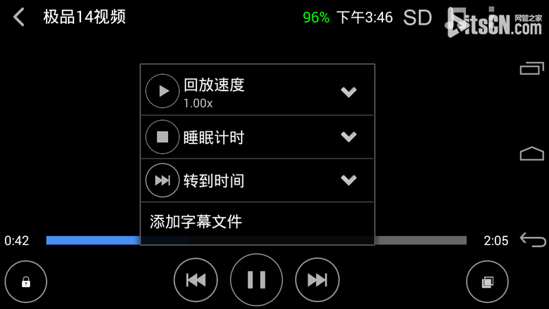 播放界面,结合了多种手机播放器的相关优点,支持手势操作,这点和MX手势完全相同!左半边上下滑动是亮度,右半边上下滑动是声音,画面中左右滑动是快进快退!