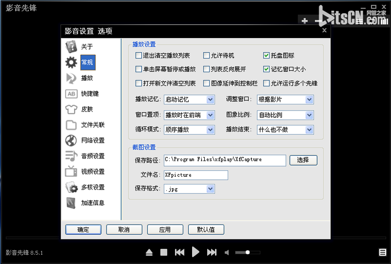 新款软件个人比较喜欢先进入设置界面看个究竟,之后再使用。右击Xfplay区域,选择设置,进入影音先锋的设置选项。