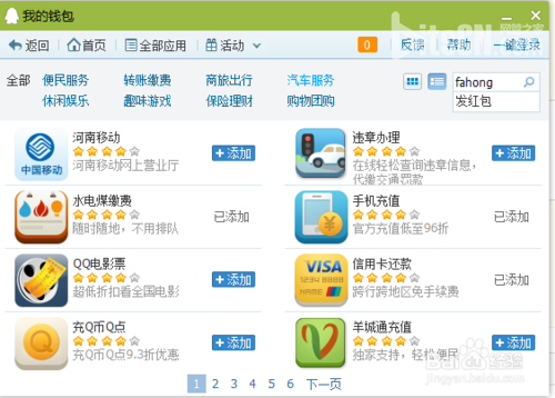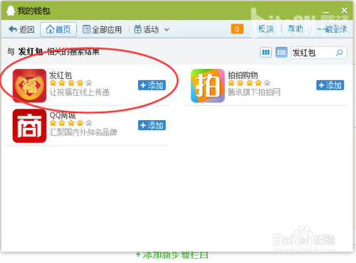 5、搜索之后下面的栏目里会列出一个发红包应用,我们选择添加,