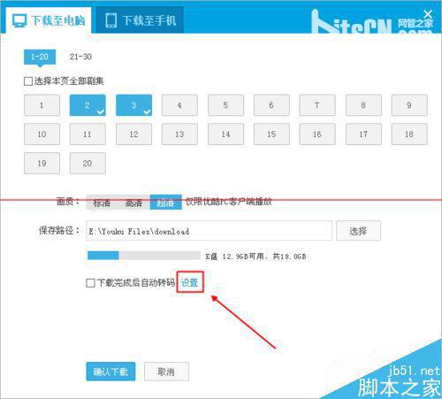 2、在弹出的下载窗口中,先勾选好集数,然后点击超清,(PS:需先登录优酷帐户)接着点击下方的“ 设置 ”选项。
