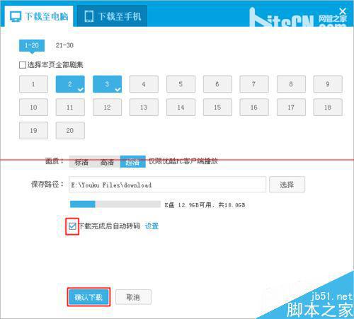 4、接着返回到上一层,将“ 下载完成后自动转码 打√ ”再点击“确认下载”即可,接下来耐心等待下载完毕即可。