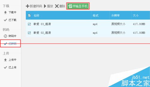 5、好啦!待下载完毕和自动转码完成之后,我们再打开下载管理页面,进入“已转码”选项,将视频传输到手机即可。