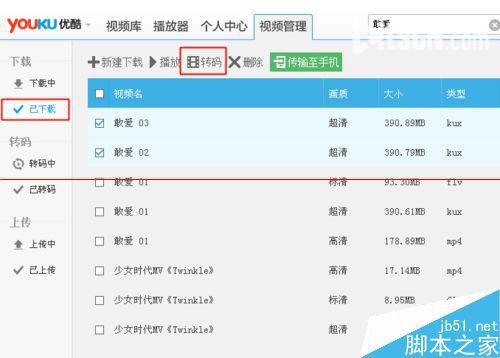 1、如果你在下载前,忘记勾选设置自动转码了,那么也是可以从“已下载”这里进行手动转码。步骤如下,在已下载页面“勾选”需要转码的影片,然后点击上方的“转码”按钮。