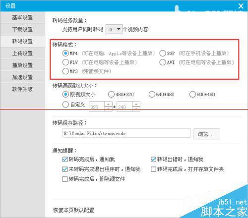 3、弹出设置窗口之后,在转码设置这里,可以看到转码格式有多种,一般情况下,我们是放到手机上播放的话,可以选择为MP4或3GP ,然后点击“保存”即可。