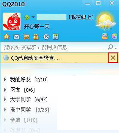 1.当您成功登录后即可在QQ面板上查看QQ安全检查提示,您可通过点击“X”主动关闭提示(如下图1);