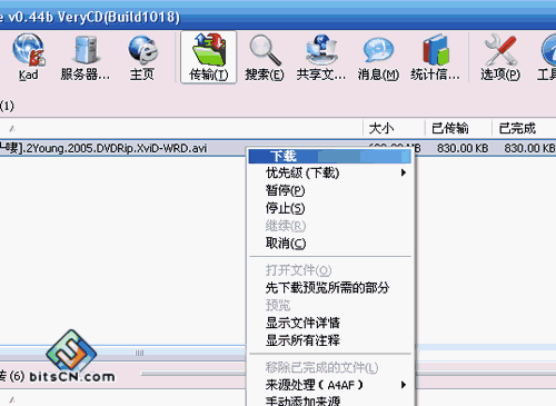 在“传输”就可以看到下载的状态,并且在任务上点右键还能实现“暂停”,“取消”等功能。 |