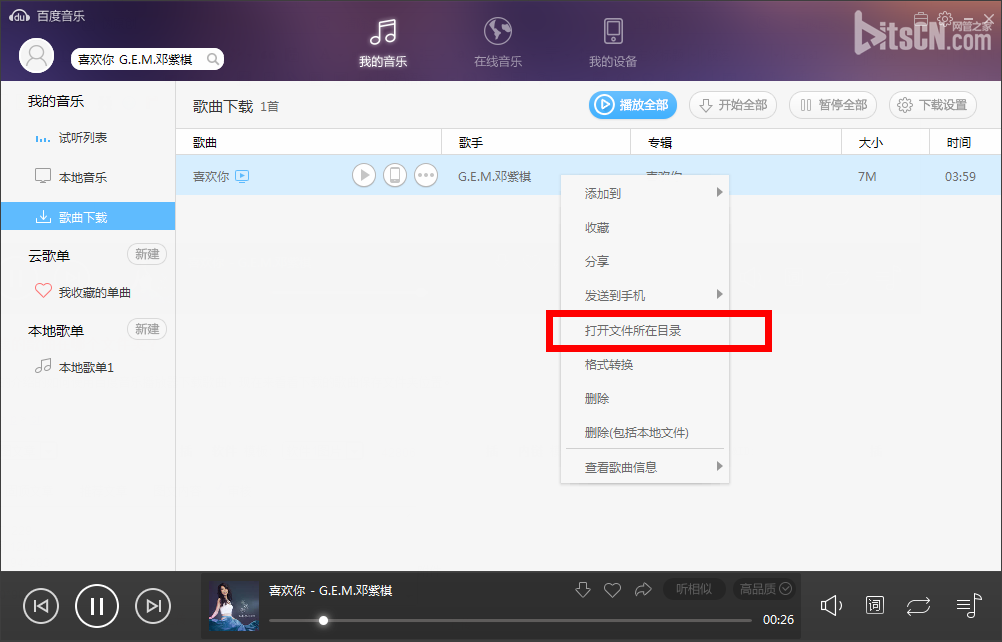 2、在下载的歌曲列表选中一首下载的歌曲,右键选择打开文件所在目录,就是百度音乐下载歌曲保存的文件夹位置。