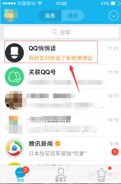 进入QQ悄悄话界面,可以看到损友刚刚给你发的消息,点击最上面的蓝色块,进入聊天记录区域。