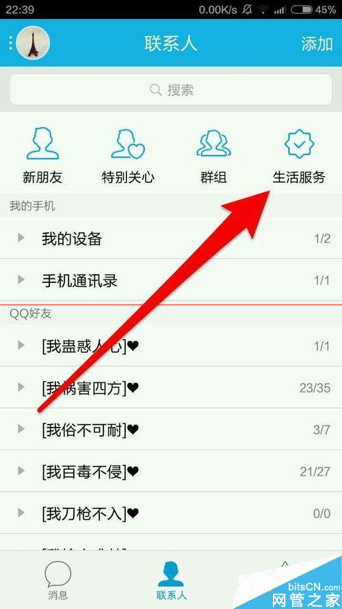 2、手机QQ联系人页面上方可以找到“生活服务”