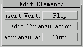 编辑元素的设置比较少(如图82所示),共有五个按钮,而且基本都在前面讲过,这里只作一下简单说明:insertvertex(插入点)命令可以在元素上直接单击来插入点;flip(反转)可以使选中元素的表面法线反转;edittriangulation(编辑三角面)按钮被按下后,元素会被显示为三角面构成,这时可以通过连接两个点来改变三角面连线的走向;retriangulate(重划分三角面)按钮是将选择的元素中的多边面(超过四条边的面)自动以最好的方式进行划分;turn按钮也是改变三角面连线的走向,不过它只要选中后单击视图中三角面的连线就可以了(注意三角面的连线是用虚线表示的)。