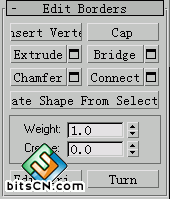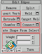 extrude可以挤压边界;chamfer可以将边界分解为两条;connect是在两条相邻的边界之间的面上创建连接线;createshapefromselection是将选择的边界复制分离出来;下方的输入框是调节边界的weight(权重)和crease(褶皱)值。这些命令与编辑边中的命令作用是相同的,设置也是完全一样的。