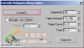 segments值是拉伸面的段数值;taperamount值可以使拉伸的面呈锥形;tapercurve值使曲线呈锥形,不过拉伸部分的两端的面不会改变;twist是将拉伸的面进行旋转扭曲。默认状态下拉伸出的面的方向是与曲线的方向平行的,这样有可能会与原始面成一定角度,如果勾选aligntoface项,那么就会沿着面法线的方向进行挤压了。