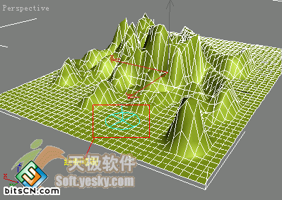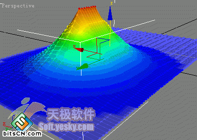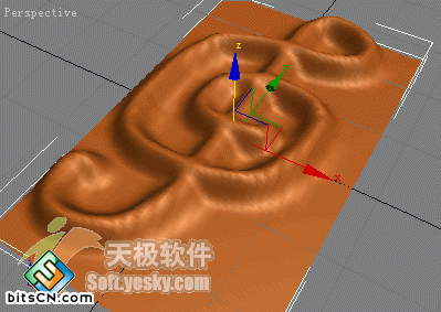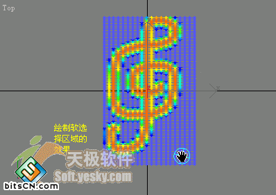 下方的这个区域为paintsoftselection(绘制软选择区域),这是3dsmax7中新增的功能,非常的强大实用。顾名思义,我们可以用鼠标直接在物体上绘制出软选择的区域,可以绘制出任意的图形,呵呵,先来试一试,在一个多边形平面上绘制出如图47所示的图案,就和用笔画画儿一样。再将选择区域向上移动一些,加上一级细分,就得到了如图48所示的效果,很有意思吧。