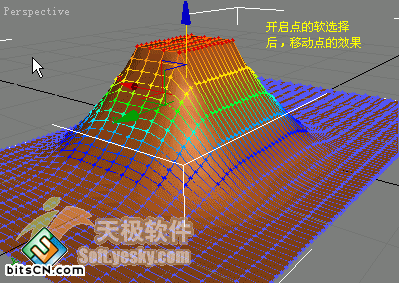 软选择可以将我们当前选择的子层级的作用范围向四周扩散,当变换的时候,离原选择集越近的地方受影响越强,越远的地方受影响越弱。如图44所示,被选中并移动的点为红色,作用力由红色到蓝色逐渐减弱,从这个图上大家能看到软选择的效果。打开软选择卷展栏(如图45所示)。