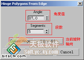 首先是hingefromedge命令,我们选择面后,打开它的设置窗口(如图78所示),先单击选择当前旋转轴向按钮,然后在多边形上选择相应的边,增加角度值,所选面就会以选择的边为中心进行旋转拉伸,增加段数可以使拉伸出来的部分呈圆弧状,效果如图79所示;其次是extrudealongspline命令,在使用此命令之前,我们应该先创建一条曲线。