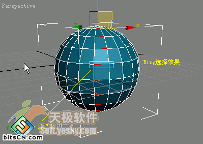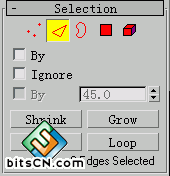下方是四个加强选择功能的按钮。shrink和grow分别是收缩和扩张选择区域,具体效果如图41所示;ring为选中与当前边平行的所有边(如图42所示),此功能只能应用在边和边界层级中;loop为选中可以与当前选择的部分构成一个循环的子物体(如图43所示),此功能也只能应用在边和边界层级中。