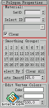 接下来时smoothinggroups(光滑组)。我们可以选择面然后单击下面的一个数值钮来为其指定一个光滑组,单击selectbysg按钮,在弹出的窗口中输入光滑id号就可以选中相应的面了;clearall命令是从选择的面中删除所有的光滑组;autosmooth命令可以基于面之间所成的角度来设置光滑组,如果两个相邻的面所成角度小于右侧输入框中的数值。那么这两个面会被指定同一光滑组。