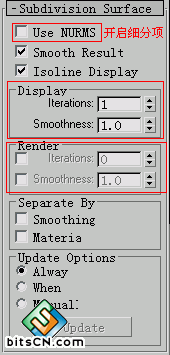 在最下面的updateoptions(更新选项)区域中,我们可以选择何时将视图中的多边形更新为细分状态,默认为always(随时更新),这种更新方式最直观,也是最耗费系统资源的;whenrendering是只有在渲染时才对视图进行更新;第三种是手动更新,更新时需要单击update按钮。