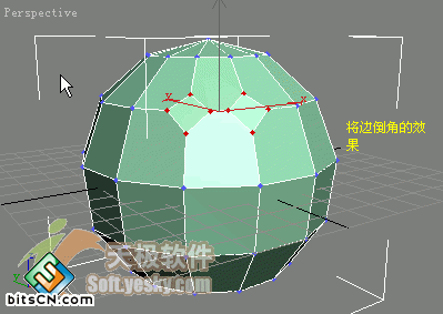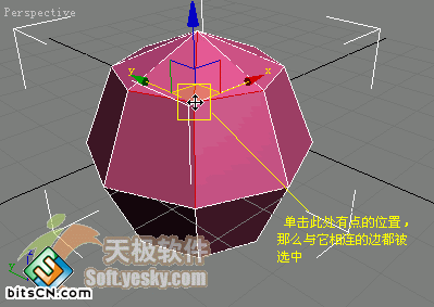 第一个是byvertex(通过点选择),它只能在除了点以外的其余四个子层级中使用。比如进入边层级,勾选此项,然后在视图中的多边形上点击,注意要点击有点的位置,那么与此点相连的边都会被选择(如图40所示),在其它层级中也是同样的操作;