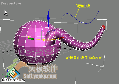 选择要挤压的面,打开它的设置窗口(如图80所示),单击上方的长条按钮,然后在视图中点击刚刚创建的曲线,成功后曲线的名称会出现在按钮上,这时面已经依据曲线的形状进行了拉伸(如图81所示)。