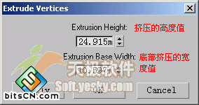 首先是extrude(挤压)命令,无论是挤压一个点或是多个点,对于单个点的效果都是一样的,选择挤压按钮,然后直接在视图上单击并拖拽点,左右移动鼠标,此点会分解出与其所连接的边数目相同的点,再上下移动鼠标会挤压出一个锥体的形状(如图58所示),我们也可以打开它的设置框(单击按钮右侧的小方块)(如图59所示)进行精确挤压。