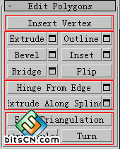 hingefromedge(以边为中心旋转拉伸)和extrudealongspline(沿样条挤压)是在extrude的基础上加强了的挤压功能,在很多情况下使用它们可以有效的提高建模的速度。两者在使用时都要先在其设置框中进行设置。