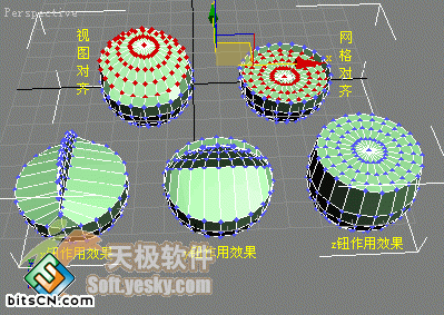 makeplanar(创建平面)是将选择的子物体变换在同一平面上,后面的三个按钮是分别把选择的子物体变换到垂直于x,y和z轴向的平面上;viewalign(视图对齐是将被选子物体对齐到当前视图平面上;gridalign(网格对齐)是将被选子物体对齐到当前激活的网格上。具体的效果56如图所示。