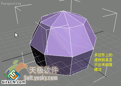 edittriangulation(编辑三角面)按钮被按下后,多边形的隐藏边会显示出来(如图68所示),可以看得出多边形是由三角面够成的,可以通过连接两个点来改变三角面连线的走向;turn按钮也是改变三角面连线的走向,不过它只要单击视图中三角面的连线就可以了,注意单击的是虚线。