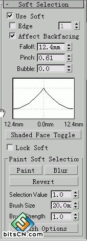 接下来可输入数值的三项为调节软选则衰减范围的形态,并且此形态显示为下方的曲线图形。falloff指定衰减范围的数值大小;pinch和bubble值用来调节衰减范围的局部效果,比如是衰减的越来越快还是越来越慢,是先慢后快还是先快后慢,因为调节他们的数值可以直接在下面的图形和视图中直接看到效果,所以大家多尝试一下就会熟悉了,这里不再赘述。