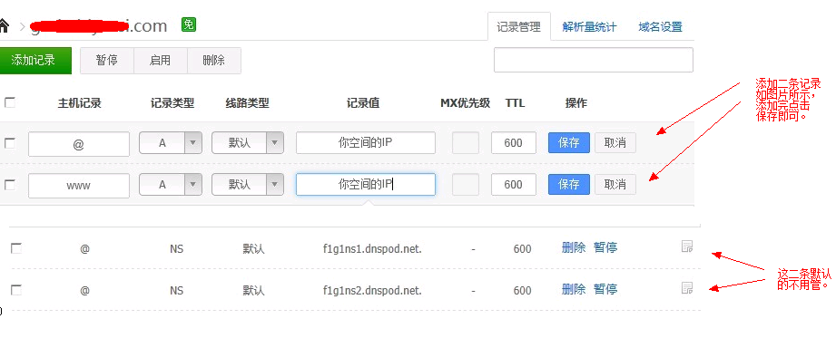 以DNSPOD为例子,下面是DNSPOD的解析教程: