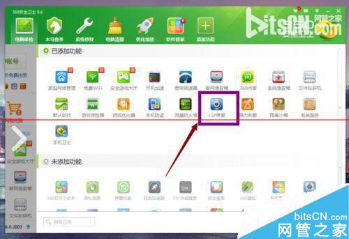 2、我们在功能大全中找到“LSP修复”,这个功能一般都是默认安装了的,即使没有网络也是能够使用的。